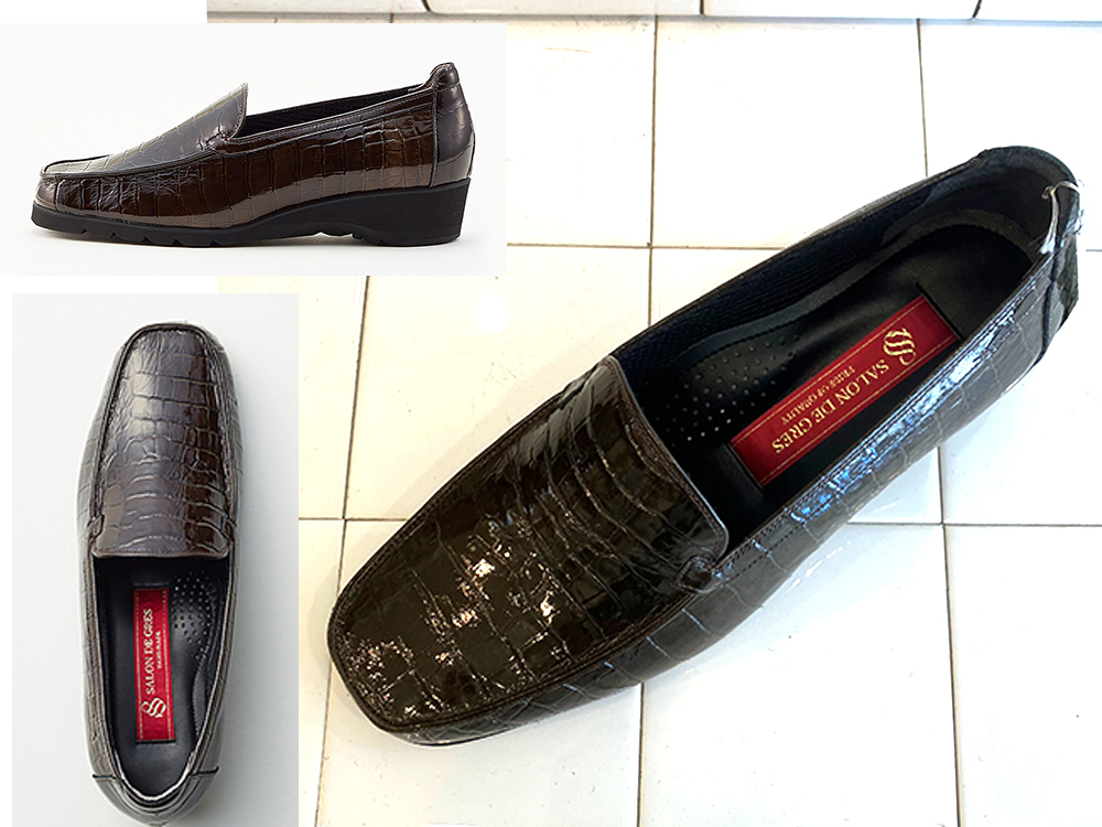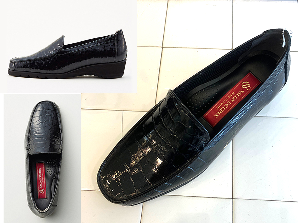 クロコ型押しエレガントなエナメルローファー。3.5cmヒール