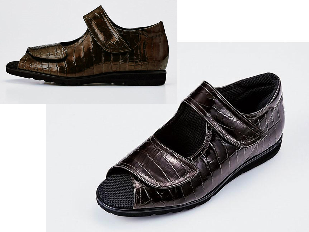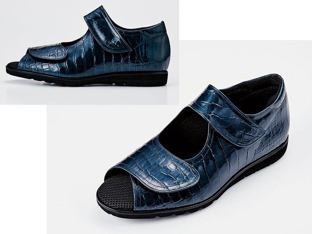 クロコ型押しエナメル ベルトで調節できるベルクロサンダル。